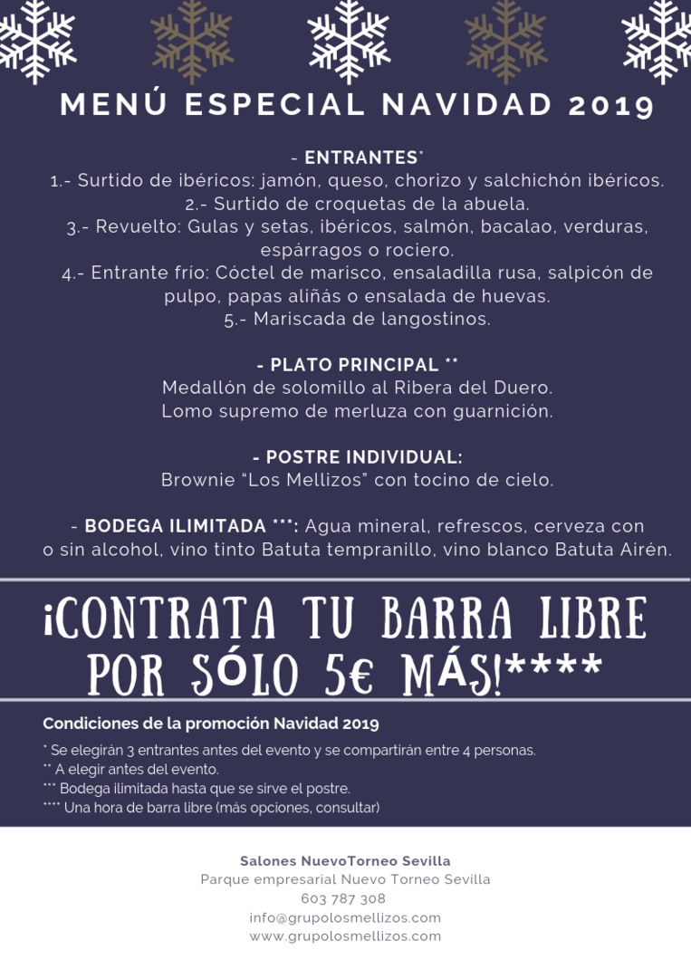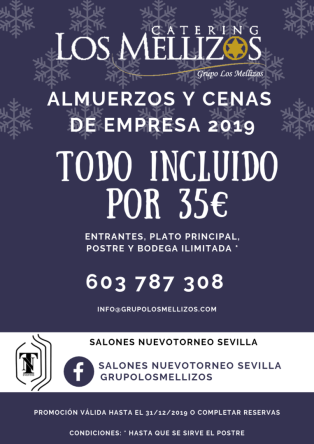 Salones NuevoTorneo Sevilla os ofrece un espacio innovador y la mejor oferta gastronómica para las cenas y almuerzos de empresas esta Navidad 2019. Un menú con todo incluido por 35 euros por persona.